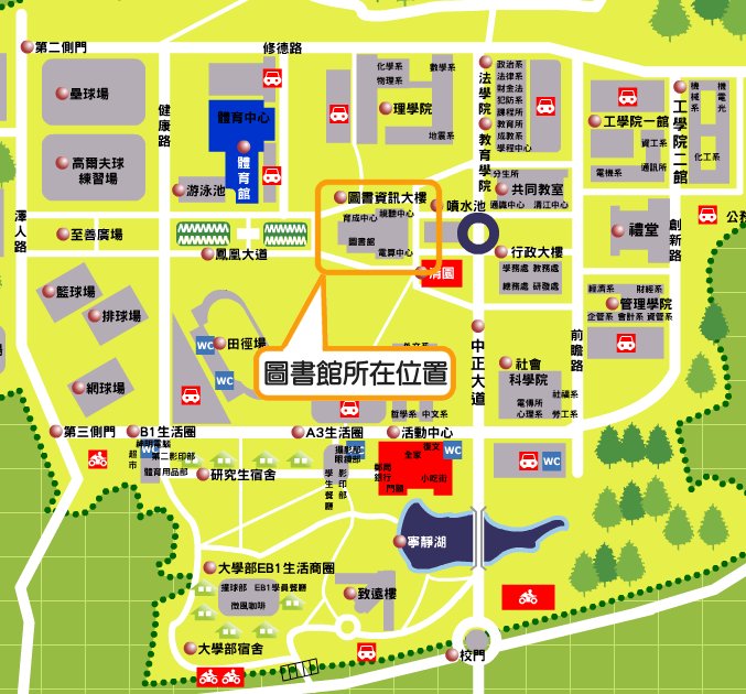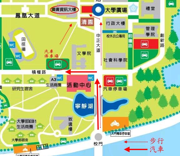(3)汽車請憑臨時通行證進入校區,並停放於文學院旁停車場(位置圖);機車請停放校外。